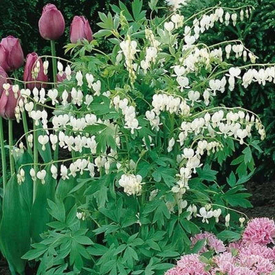 Рассада Дицентры великолепной Alba (Альба) привнесет в цветник немного экзотики. Необыкновенные цветки этого растения, похожие на «разбитые» белые плоские сердечки (до 3 см диаметром) располагаются длинными рядами на тонком стебле высотой до 1 м. Темно-зеленые листья крупные, большая часть расположена у основания. Первые цветы распускаются в конце апреля; в середине лета наземная часть растения отмирает, осыпая семена. Хорошо смотрится в миксбордерах, посадках группами, в единичной срезке.