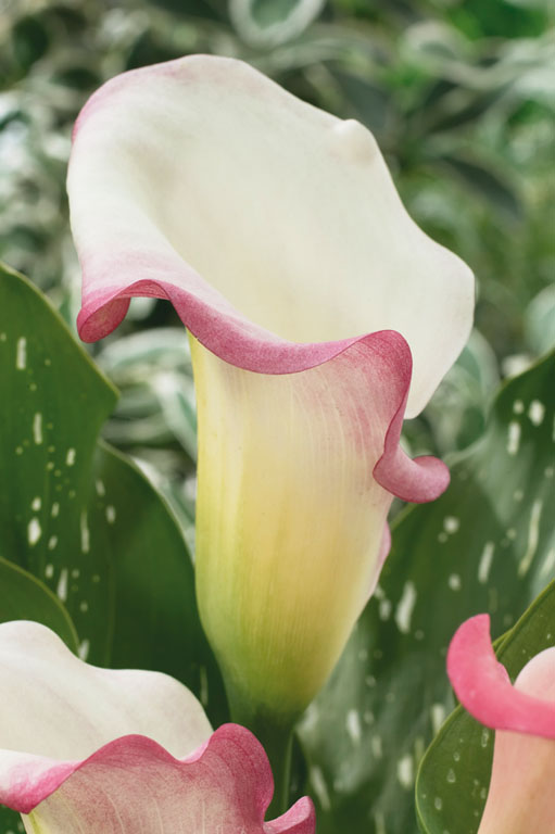 Луковицы Каллы гибридной Парфейт (Parfait Calla) с очаровательным цветком, которому под силу замедлить ход времени. Он имеет гармоничную расцветку — персиково-желтое покрывало обрамлено темно-розовой каймой. Листья темно-зеленого цвета. По ним разбросаны в хаотичном порядке белые точки и штрихи. Растение не имеет запаха. Оно не переносит сквозняков и пересыхание земляного грунта. При выращивании цветка в качестве комнатной культуры, следят, чтобы вода всегда оставалась в поддоне. В саду для него подыскивают место в низине или высаживают около кустарников и деревьев, которые защищают его от палящих лучей.