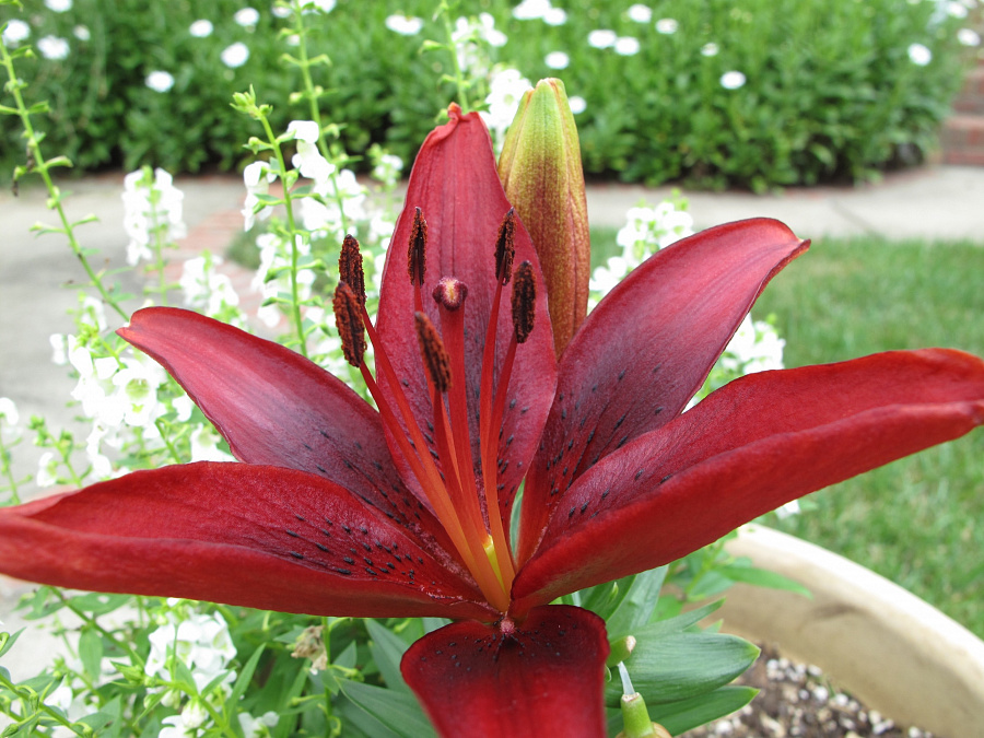 Окраска цветка : направленные вверх цветки — глянцевые, темно-красные, с черным отблеском в центре