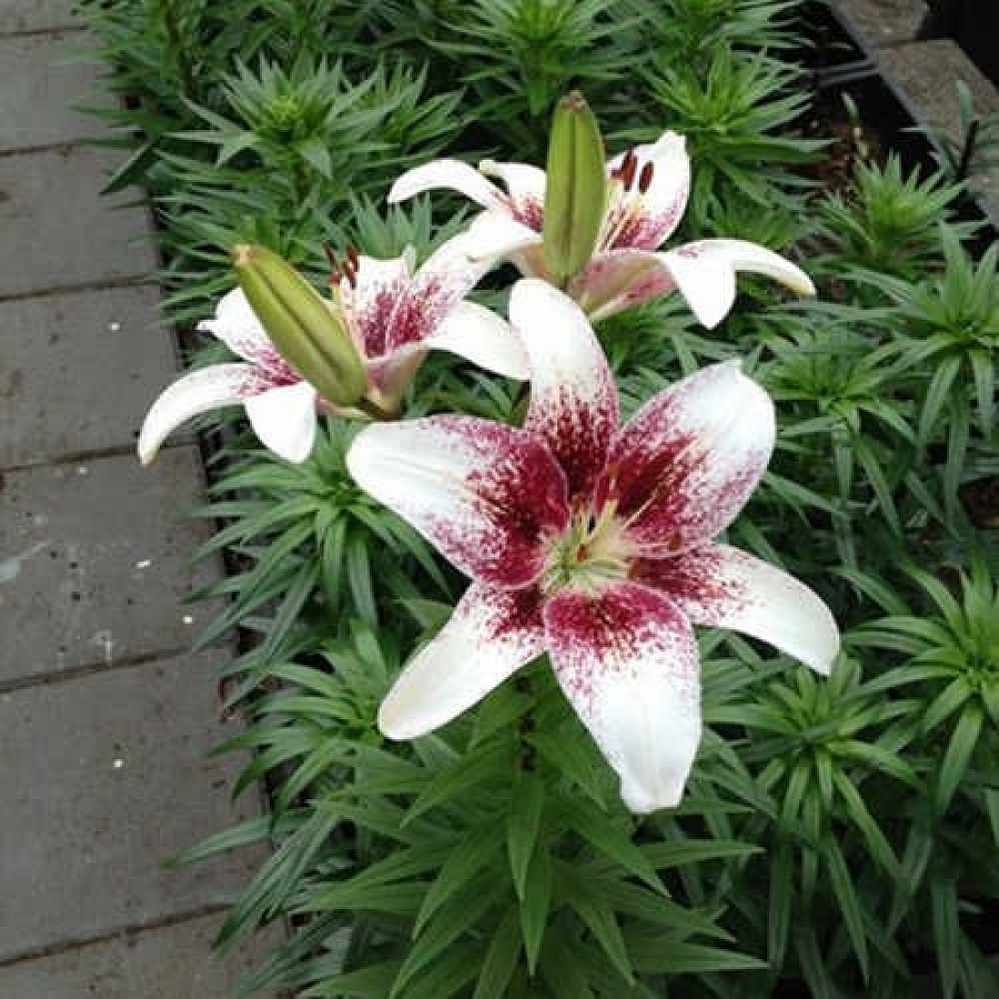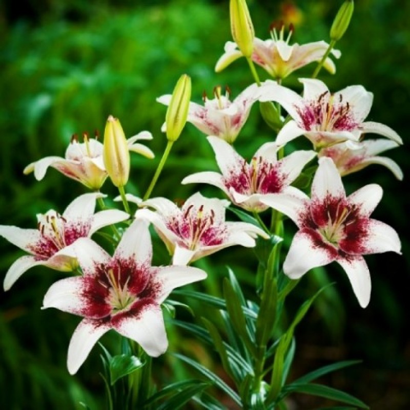 Луковицы Лилии азиатской Трайбал Кисс (Lilium asitic Tribal Kiss) ― посадочный материал для тех, кто не хочет выбирать между нежными и экспрессивными расцветками. В этом сорте объединены два оттенка: белый и насыщенный бордовый, рассыпающийся крапом по кончикам лепестков. «Изюминкой» лилии являются светло-зеленые тонкие отметины, проходящие по центру  изящно выгнутых, с атласным блеском, лепестков.