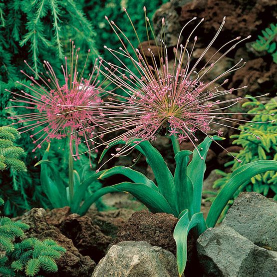 Луковицы лука декоративного Шуберт (Schubertii) – находка для любителей оригинальных растений. Близкий родственник репчатого лука цветет диковинными шарами из мелких сиреневых соцветий. Каждый отдельный цветок имеет звездчатую форму и посажен на длинный цветонос. Необычное зрелище дополняет плотный стебель и широкие, как у тюльпанов, прикорневые листья.