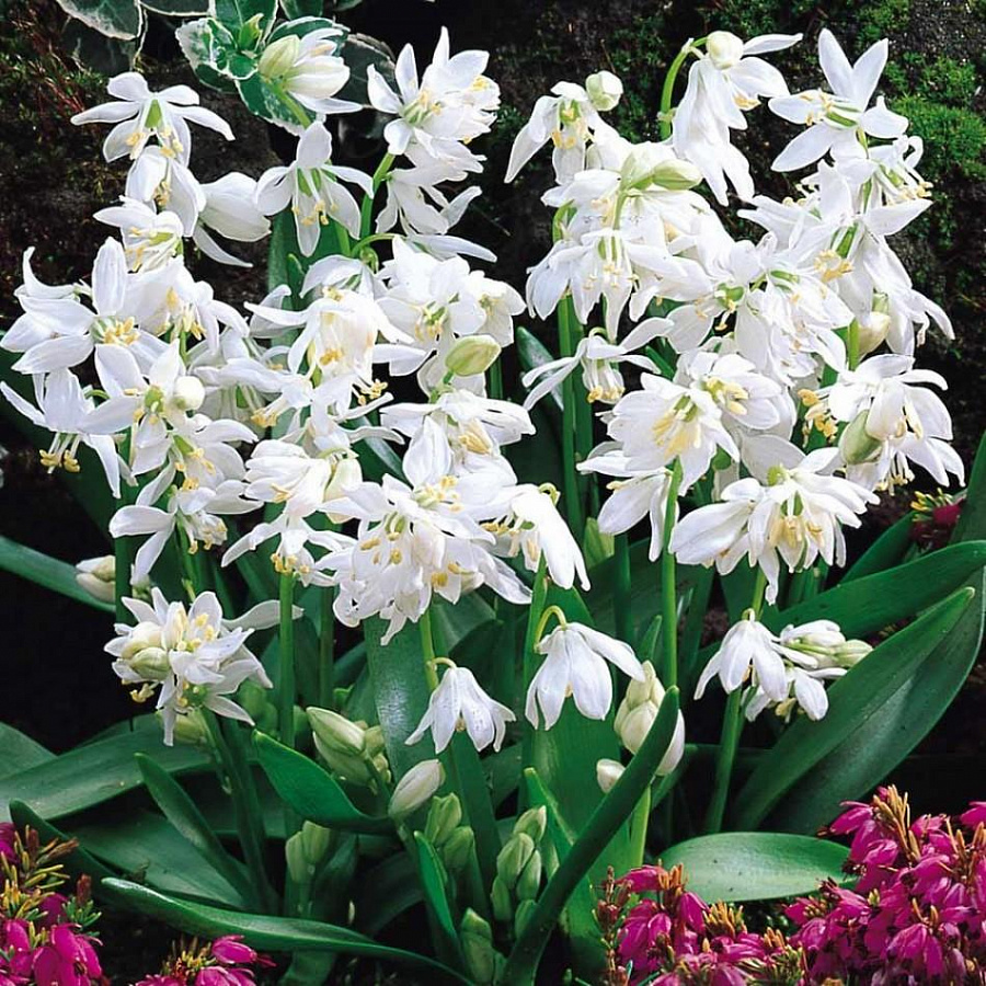Луковицы сциллы Альба (Alba) превосходный посадочный материал для ваших участков, дающий ранние цветы. Цветет это нежное растение небольшими белыми колокольчиками в соцветиях размером до 8 сантиметров, распространяя нежнейший аромат. Высота кустов всего лишь 15 сантиметров. Хотя растение из вида сциллы сибирской зимостойкости оно средней, в сильные холода требует укрытия. Светолюбиво и болезнеустойчиво. В посадке и уходе нетребовательно, не любит лишь кислые и сильно влажные почвы. За что и любимо цветоводами.